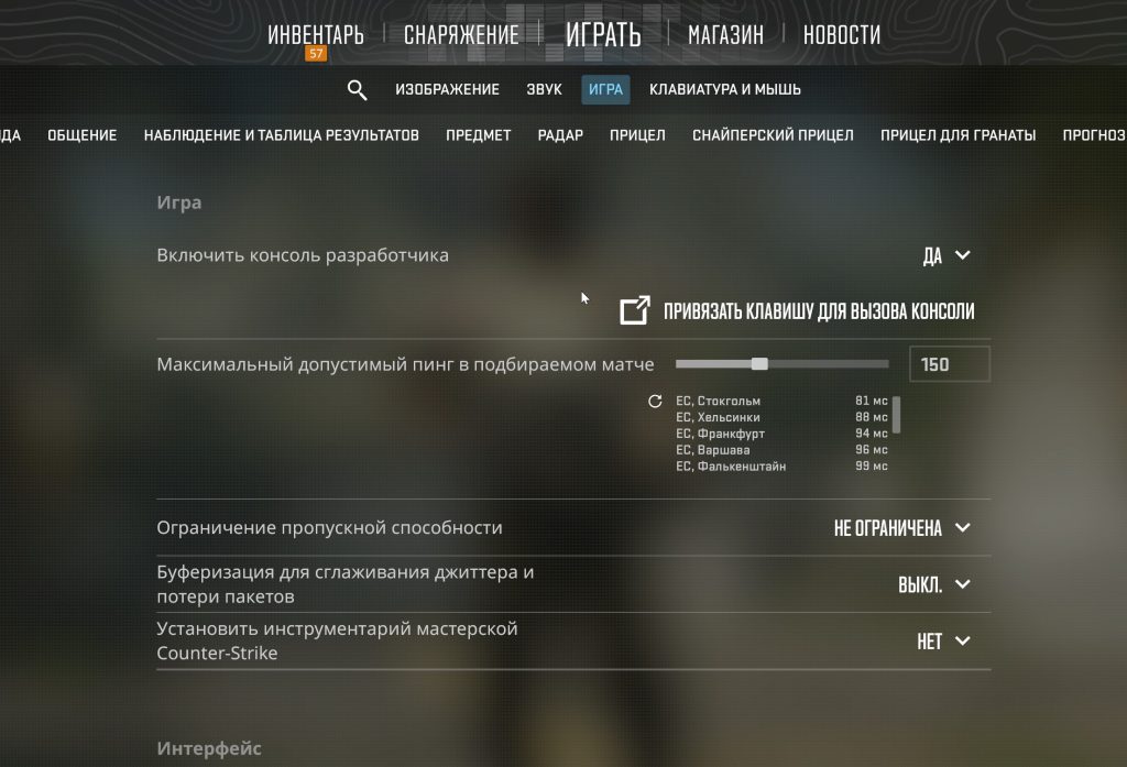 Залетай в Настройки -> Игра и ищи пункт «Включить консоль разработчика (~)». Переключай тумблер на «Да». Теперь запускай любую карту (например, Mirage) в режиме «Тренировка».