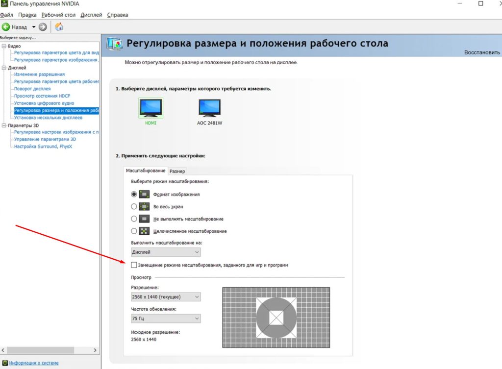 - Критически важно: Поставь галочку «Замещение режима масштабирования…» (Override the scaling mode set by games and programs).